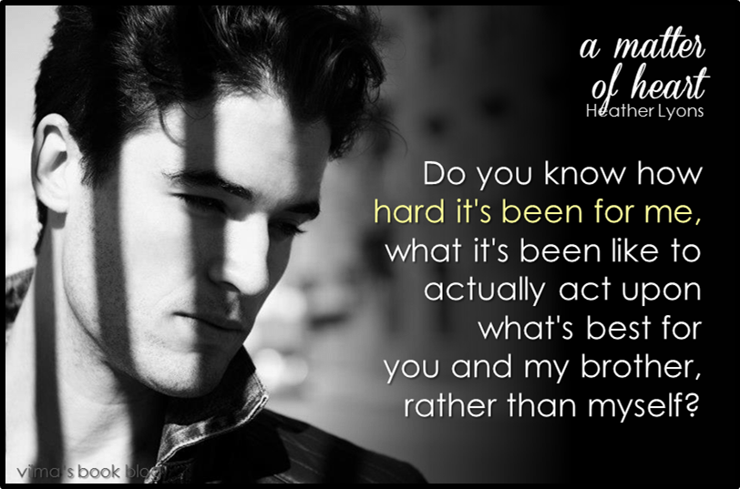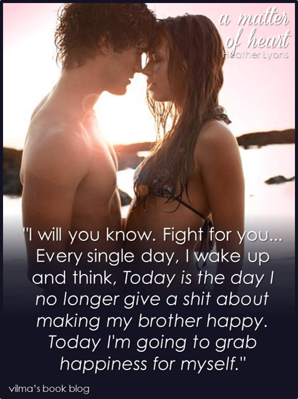 I thought that A Matter of Heart was a really heavy book… not in a bad way at all… in fact… in the most necessary way. I don’t know what’s planned for book 3, but this feels a lot like rock bottom to me. The character development that happens is significant… we learn so much more about Kellan, and we also learn more about Jonah and how he handles situations. I feel that Chloe is on a precipice… on the brink of taking matters into her own hands and writing her own destiny. This book also features a lot of action and a lot happens that I’m not even touching as I don’t want your reading experience to be diminished in any way.
